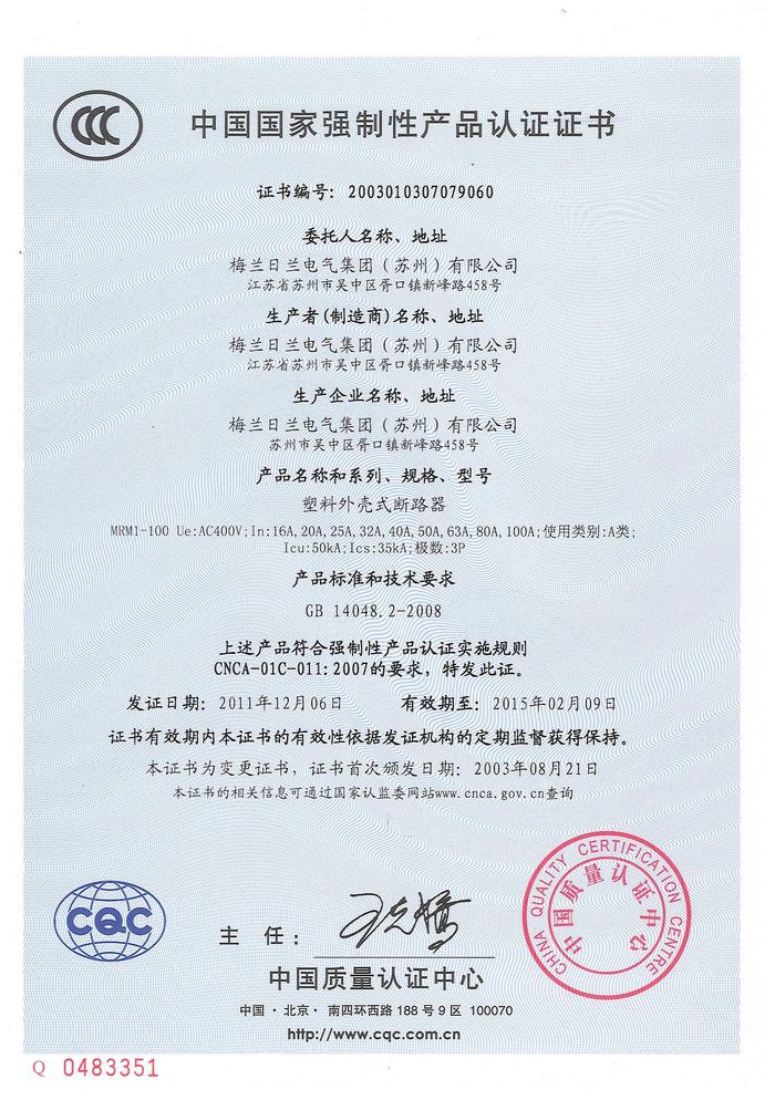 MRM1-100塑殼斷路器資質(zhì)證書(shū)